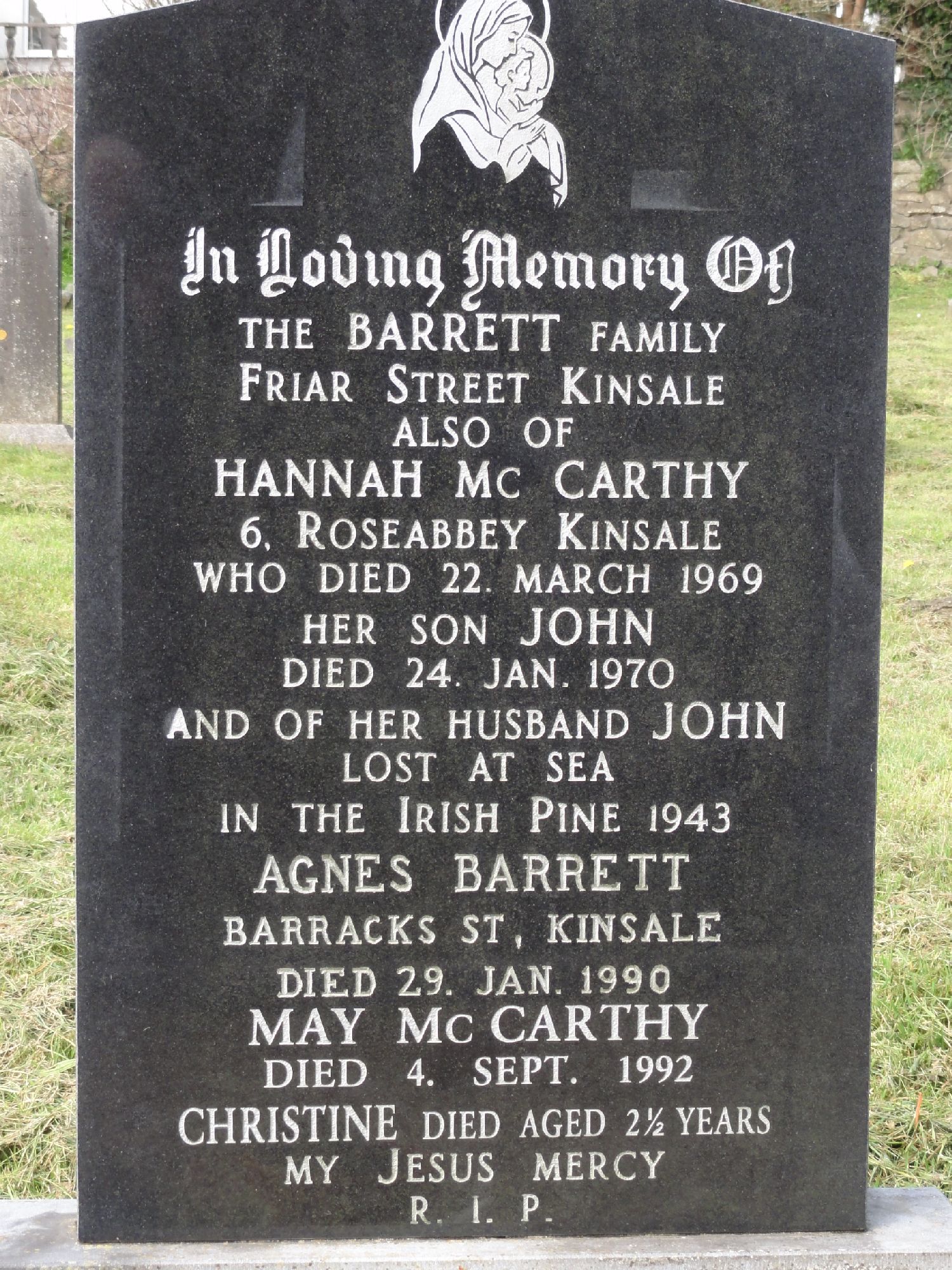 IN LOVING MEMORY OF THE BARRETT FAMILY FRIAR ST. KINSALE ALSO OF HANNAH McCARTHY 6, ROSEABBEY KINSALE WHO DIED 22.MARCH 1969 HER SON JOHN DIED 24. JAN. 1970 AND OF HER HUSBAND JOHN LOST AT SEA IN THE IRISH PINE 1943 AGNES BARRETT BARRACKS ST, KINSALE DIED 29. JAN 1990 MAY McCARTHY DIED 4. SEPT. 1992 CHRISTINE DIED AGED 2 YEARS MY JESUS MECY R.I.P.