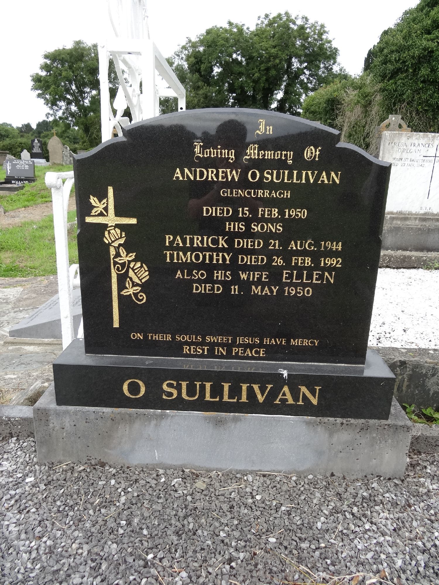 InLoving Memory ofAndrew O' SullivanGlencurraghDied 15. Feb.1950His SonsPatrick Died 21. Aug. 1944Timothy Died 26. Feb. 1992Also his Wife EllenDied 11. May 1950