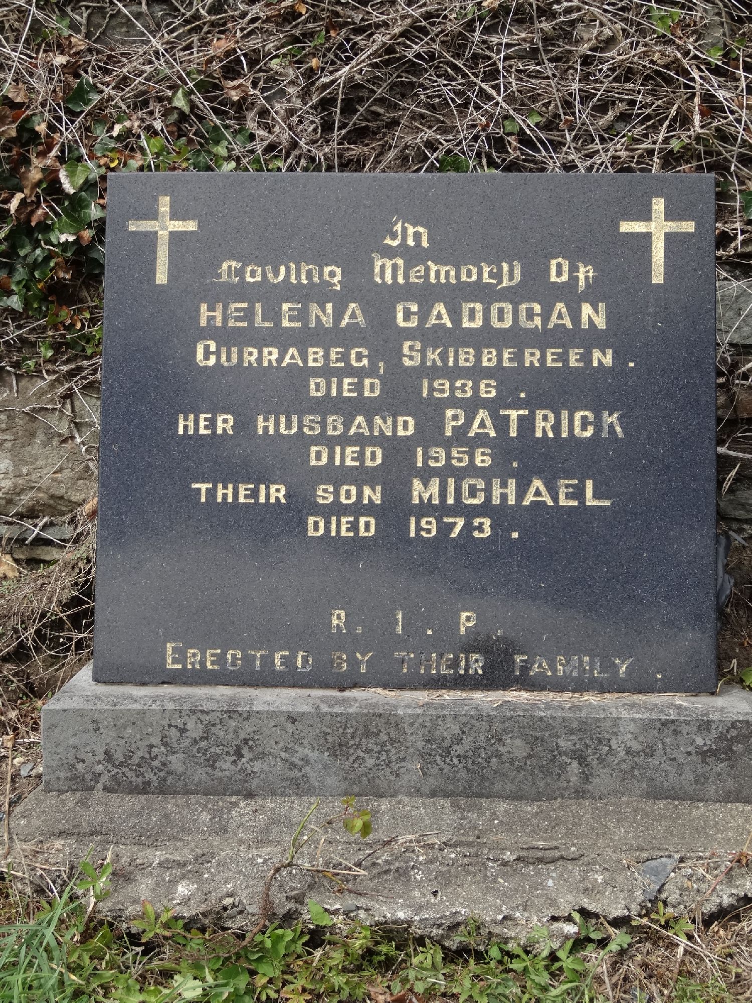 A black Stone Plague with two gold crosses dipicted on either side at front.