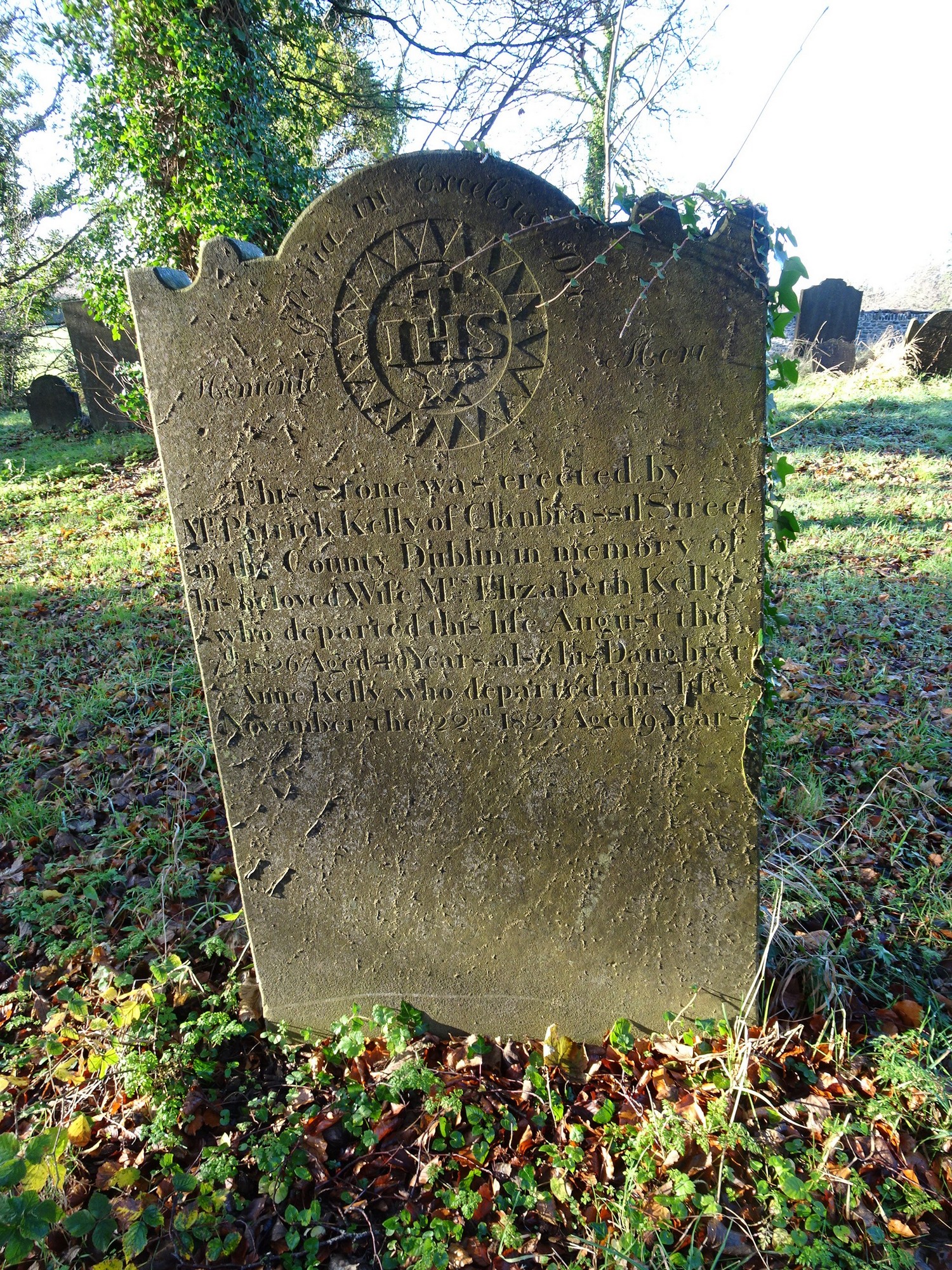 This stone was erected by / Mr Patrick Kelly of Clanbrassil Street / in the county of Dublin in memory of / his beloved wife Mrs Elizabeth Kelly / who departed this life August the / 7th 1826 aged 40 years Also his daughter / Anne Kelly who departed life / November the 22nd 1825 aged 9 years