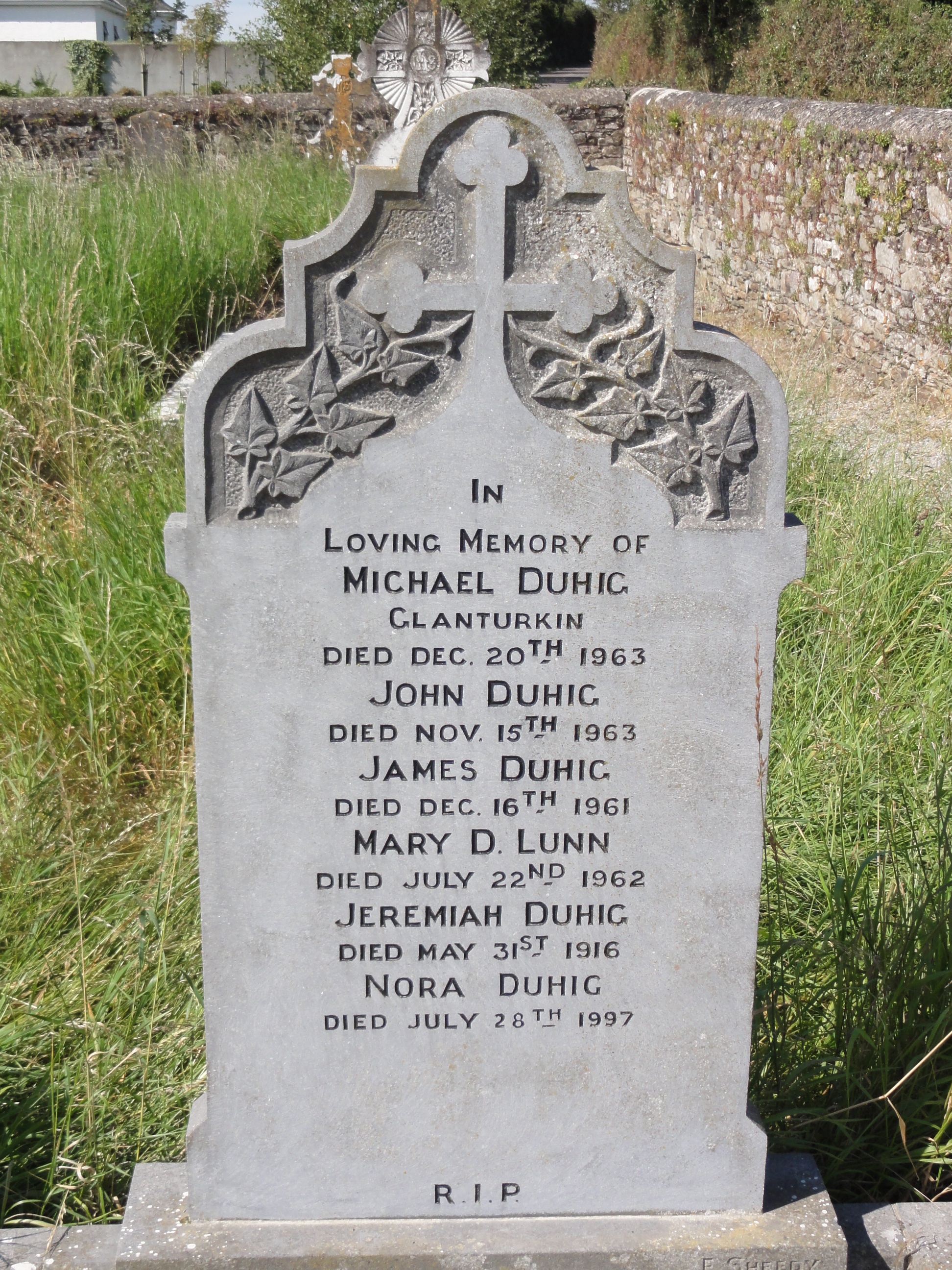 In Loving Memory of MICHAEL DUHIG Glanturkin died Dec 20th 1963 JOHN DUHIG died Nov 15th 1963 JAMES DUHIG died Dec 16th 1961 MARY D LUNN died July 22nd 1962 JEREMIAH DUHIG died May 31st 1916 NORA DUHIG died July 28th 1997