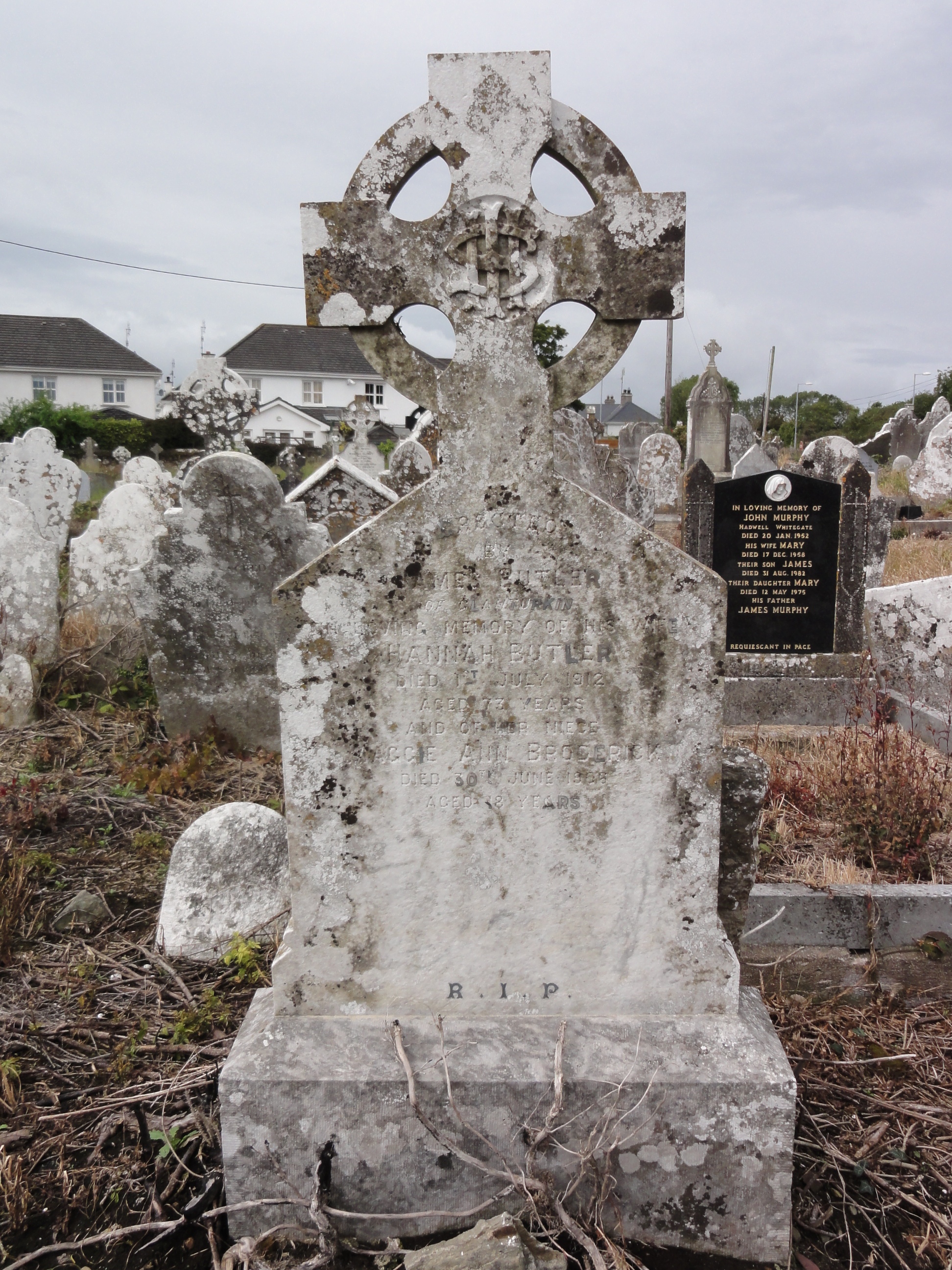 + I H S Erected By James Butler Of Glanturkin In loving memory of his wife Hannah Butler Died 1st July 1912 Aged 73 years And of her niece Maggie Ann Broderick Died 30th June 1906 Aged 18 years R I P