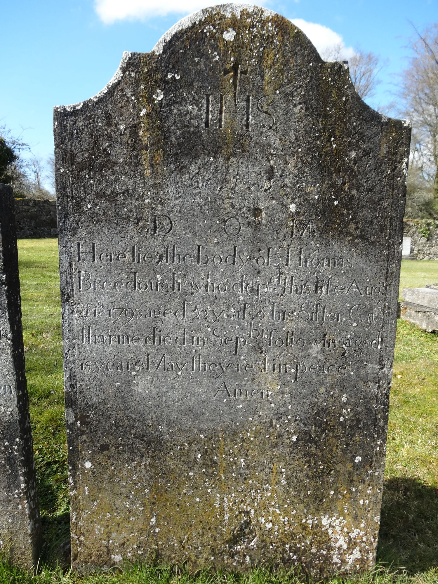 IHS DOM Here lies the body of Thomas Breedough who depd this life Augst 1st 1793 aged 22 yrs. Also his sister Ca tharine died in Spebr following aged 18 years. May they rest in peace Amen