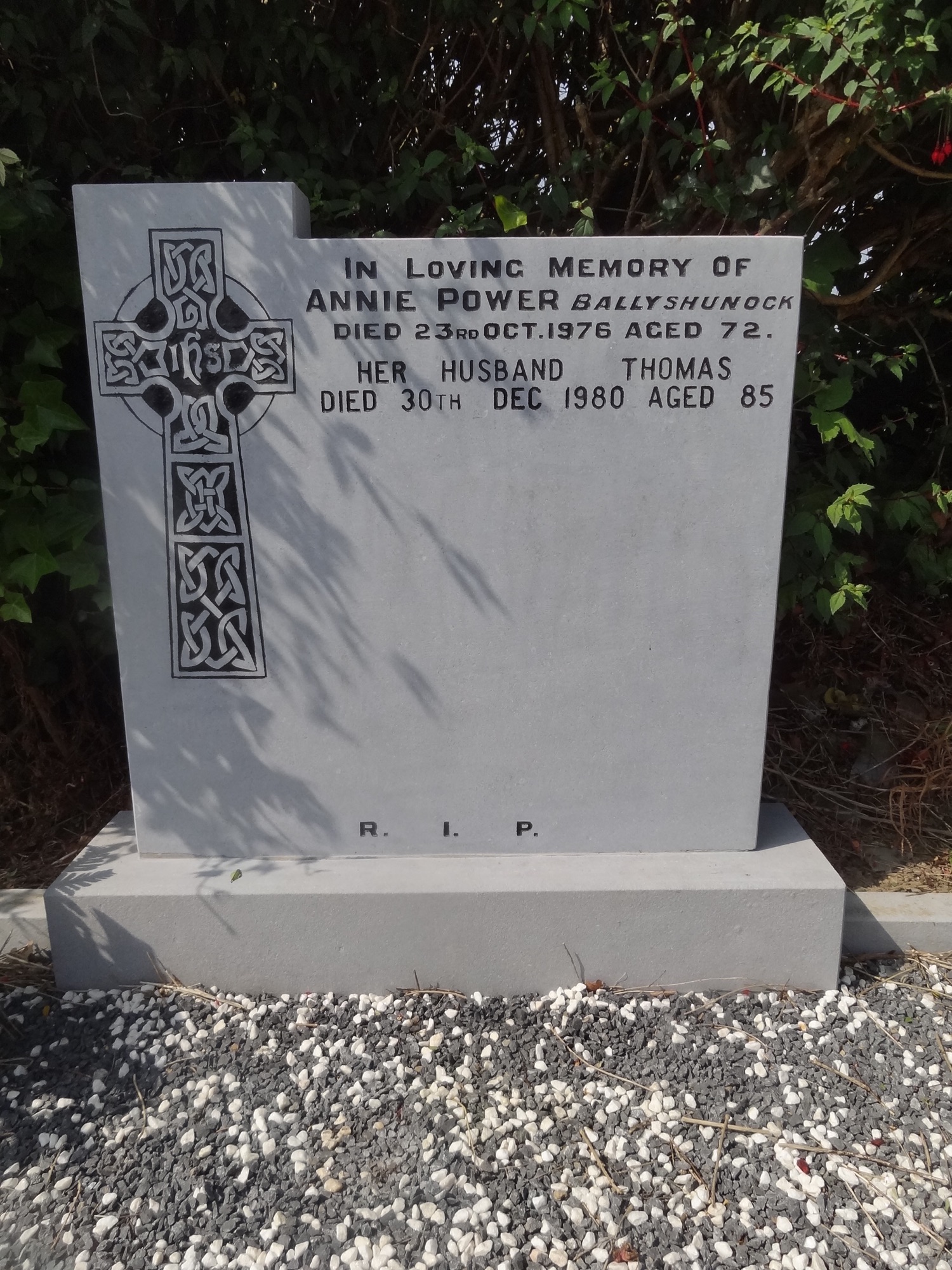 IHSIN LOVING MEMORY OF ANNIE POWER BALLYSHUNOCKDIED 23RD OCT. 1976 AGED 72.HER HUSBAND THOMASDIED 30TH DEC 1980 AGED 85