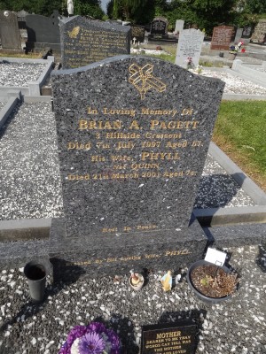 In loving memory ofBrian A. Pagett3 Hillside Crescentdied 7th July 1997 aged 67.His wife, Phyllnee Quinndied 21st March 2001 aged 74.