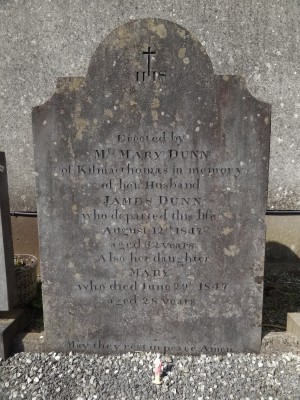 Erected byMrs. Mary Dunnof Kilmacthomas in memoryof her husbandJames Dunnwho departed this lifeAugust 12th 1847aged 62 years.Also her daughterMarywho died June 29th 1847aged 28 years.
