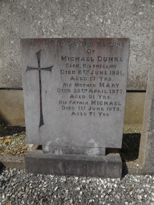 In loving memory ofMichael DunneGlen. Kilsheelandied 8th June 1951aged 17 yrs.His mother Marydied 28th April 1977aged 81 yrs.His father Michaeldied 1st June 1978aged 71 years
