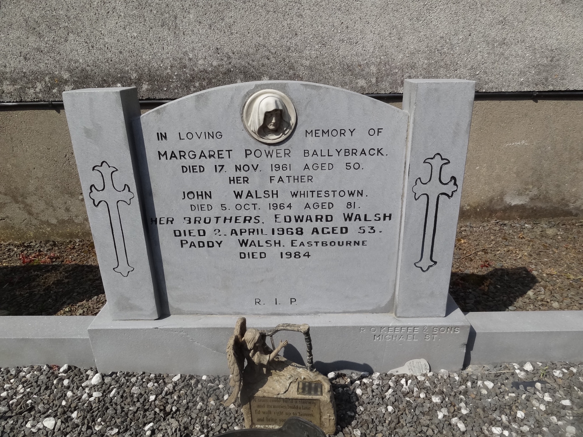 In loving memory ofMargaret Power, Ballybrackdied 17 Nov 1961 aged 50Her fatherJohn Walsh, Whitestowndied 5 Oct 1964 aged 81Her brothers Edward Walshdied 2 April 1968 aged 53Paddy Walsh, Eastbournedied 1984