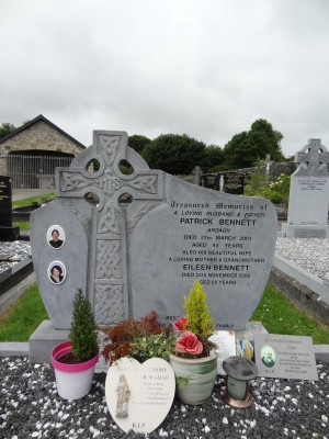Treasured Memories ofA Loving Husband & FatherPATRICK BENNETTArdaghDied 22ND March 2001Aged 45 YearsAlso His Beautiful WifeA Loving Mother & GrandmotherEILEEN BENNETTDied 24th November 2006Aged 50 Years