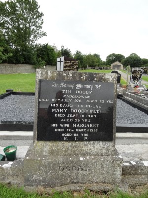 In Loving Memory OfTIM DOODYKnocknagunDied 16TH July 1976 Aged 73 YrsHis Daughter-In-LawMARY DOODY (N.T.)Died Sept 10 1987Aged 39 YrsHis Wife MARGARETDied 17TH March 1995Aged 85 YrsR. I. P.