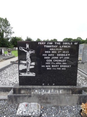 PRAY FOR THE SOULS OFTIMOTHY LYNCHBallylin.Died Dec 1ST 1953His Wife BRIDGETDied June 5TH 1981CON CROWLEYDied 17TH April 2001His Wife MARY BRIDGETDied 11TH Feb 2002