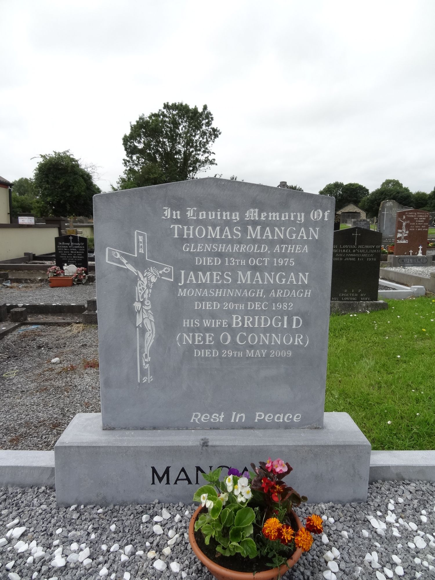In Loving Memory OfTHOMAS MANGANGlensharrold, AtheaDied 13TH Oct 1975JAMES MANGANMonashinnagh, ArdaghDied 20TH Dec 1982His Wife BRIDGID(NEE O CONNOR)Died 29TH May 2009