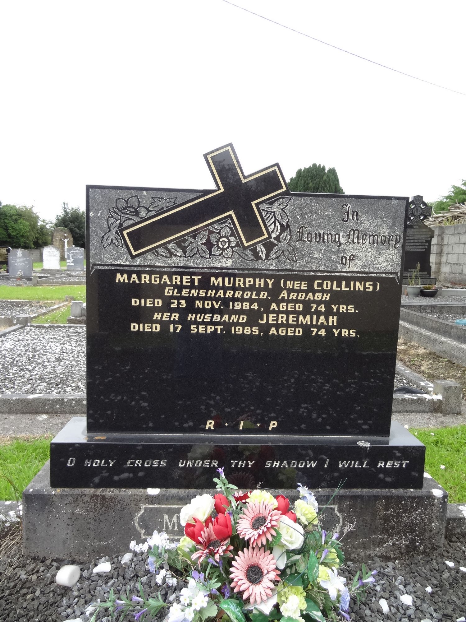 MARGARET MURPHY (NEE COLLINS)Glensharrold, ArdaghDied 23 Nov. 1984, Aged 74 Yrs.Her Husband JEREMIAHDied 17 Sept. 1985, Aged 74 Yrs.