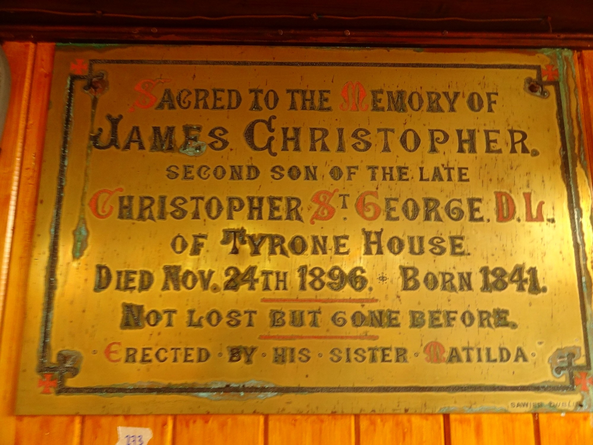 Sacred to the memory of James Christopher, second son of the late Christopher St George D.L.of Tyrone House, died Nov. 24th 1896, born 1841.Not lost but gone before.Erected by his sister Matilda.