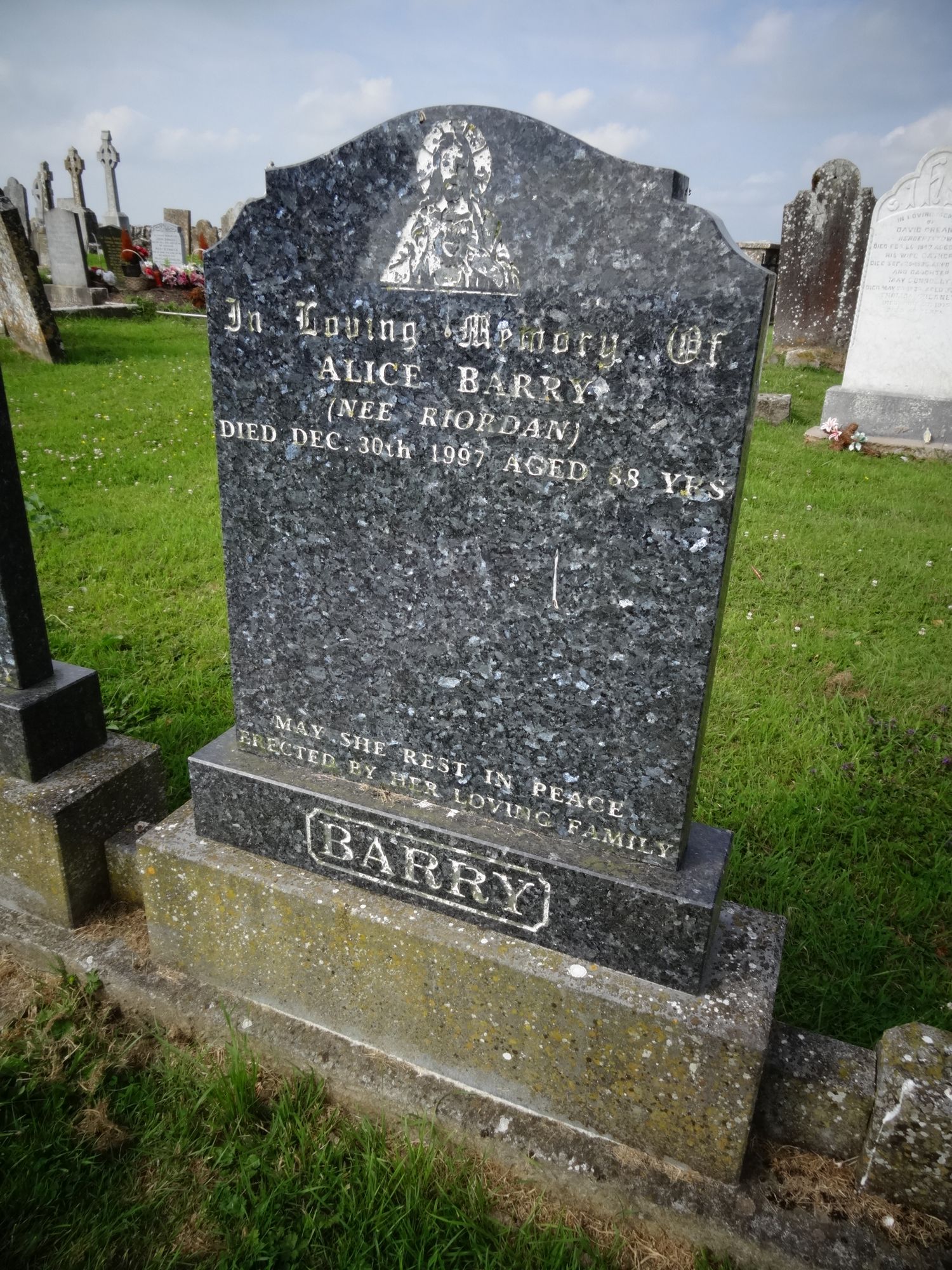 In loving memory of Alice Barry(nee Riordan)died Dec 30th 1997 aged 88 yrsMay she rest in peaceErected by her loving loving family