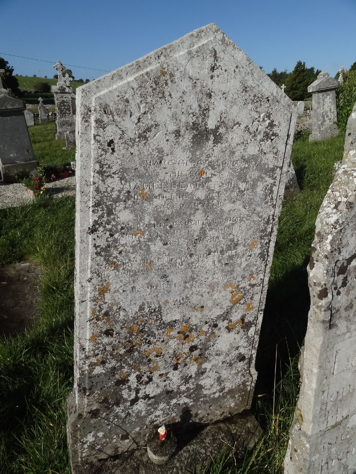Have mercy on the soul of James Beaty of Tully who died 3rd July 1859 aged 60 years also his daughter Bridget who died 10th April 1869 aged 29 years. This monument has been erected by his sorrowing widow and children. May they rest in peace Amen