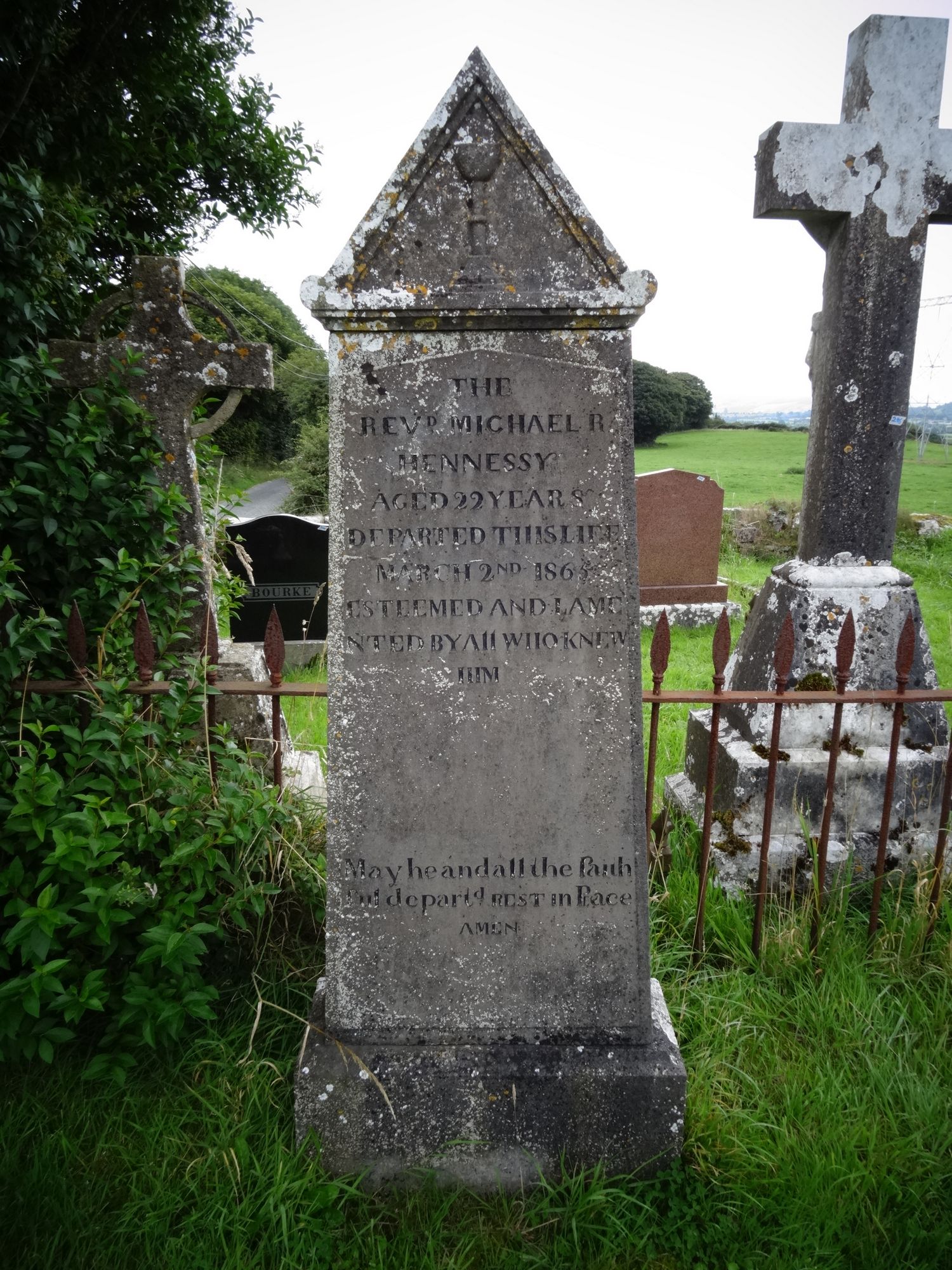 TheRev Michael RHennessyaged 22 yearsdeparted this lifeMarch 2nd 1865esteemed and lamented by all who knew himMay he and all the faithful departd rest in peaceAmen