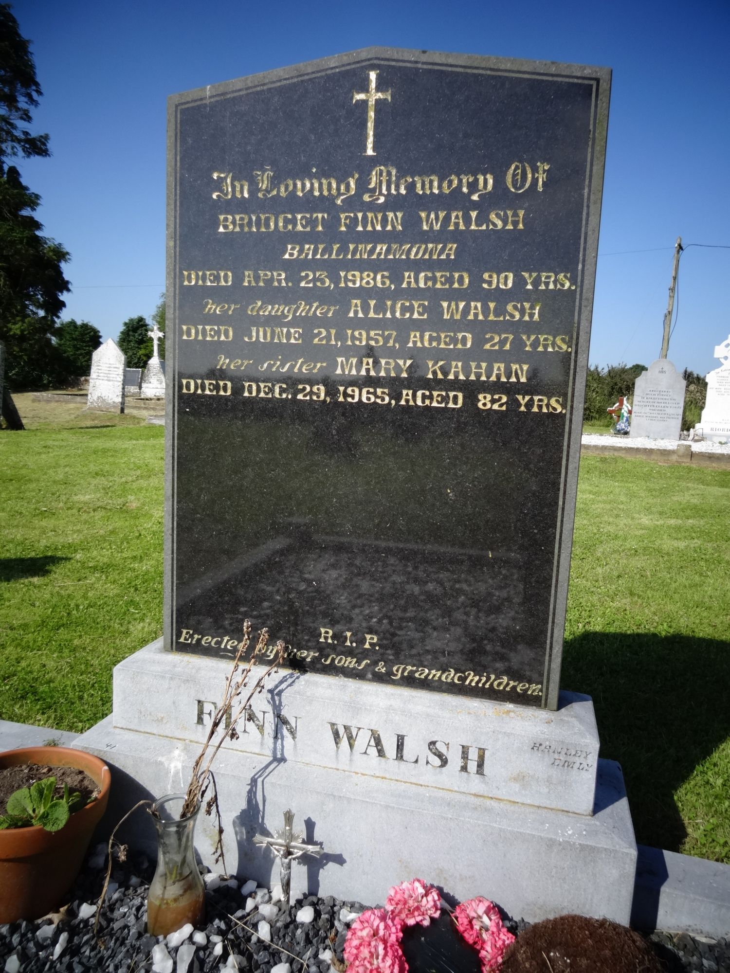 In loving memory of Bridget Finn WalshBallinamonadied Apr 23 1986 aged 90 yrsher daughter Alice Walshdied June 21 1957 aged 27 yrsher sister Mary Kahandied Dec 29 1965 aged 82 yrsRIPerected by her sons & grandchildren