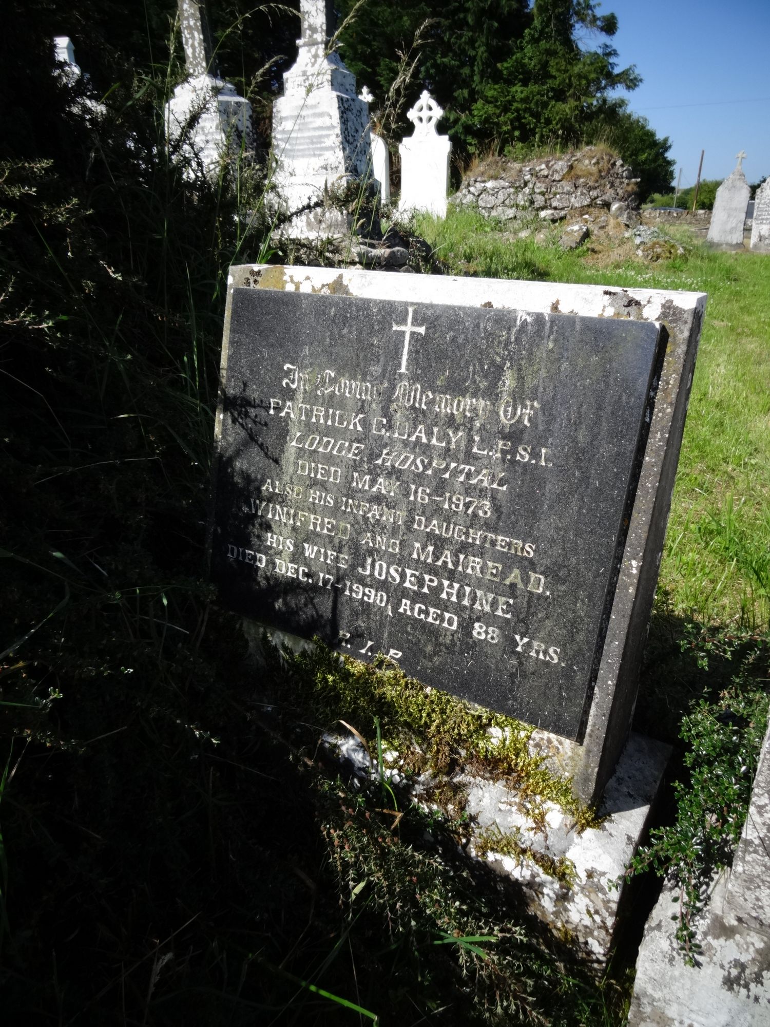In lovinf memory of Patrick G. Daly L.P.S.ILodge, Hospitaldied May 16 1973and his infant daughtersWinifred and Maireadhis wife Josephinedied Dec 17 1990 aged 88 yrs RIP