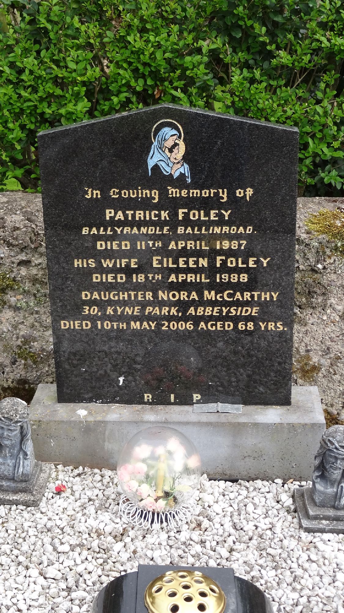 IN LOVING MEMORY OF PATRICK FOLEY BALLYRANDLE, BALLINROAD DIED 11TH APRIL 1987 HIS WIFE EILEEN FOLEY DIED 18TH APRIL 1988 DAUGHTER NORA McCARTHY 30,KYNE PARK, ABBEYSIDE DIED 10TH MAY 2006 AGED 68 YRS. R.I.P