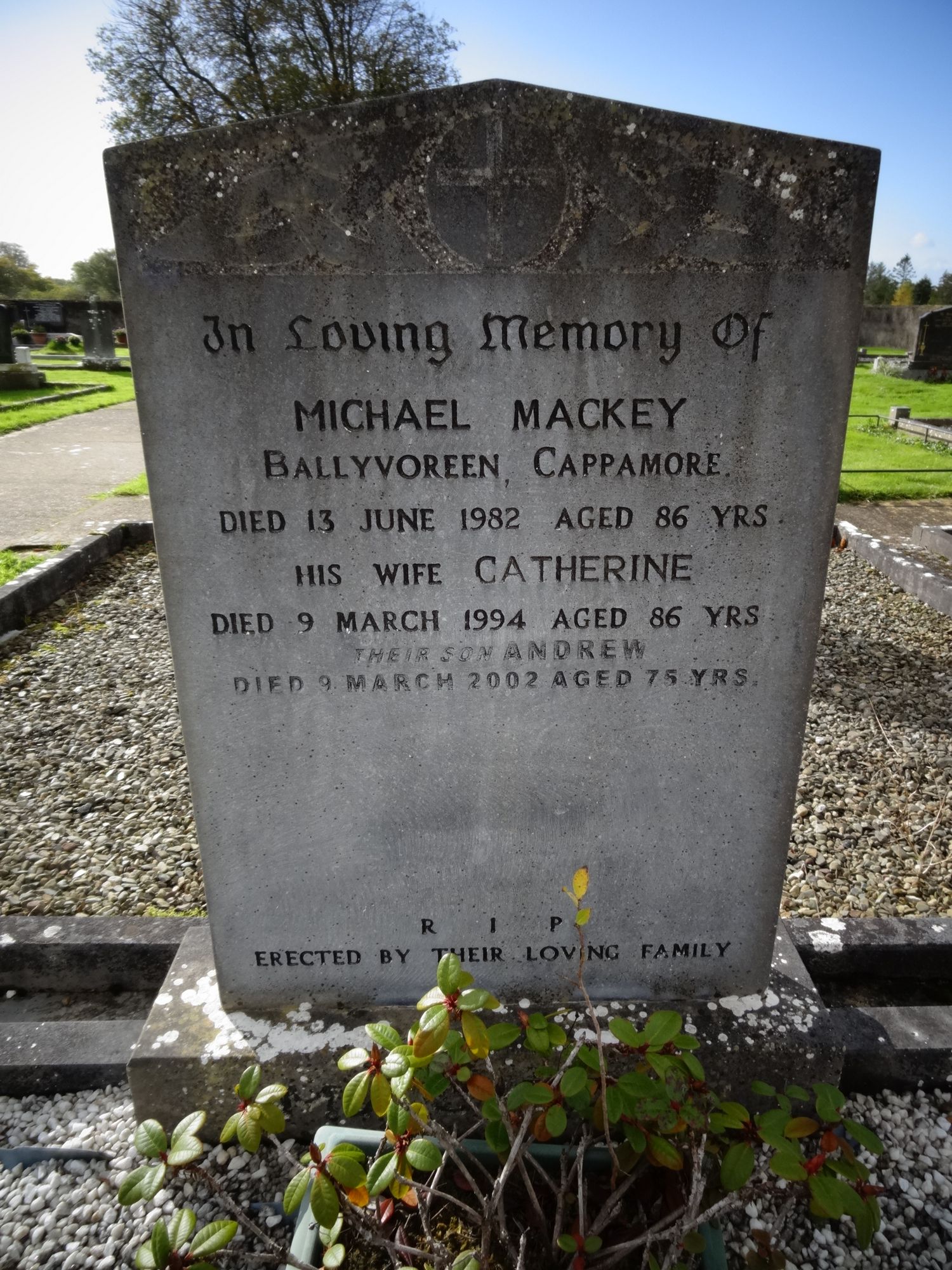 Ellen Mackey (1929-2021), known as Peggy, died on the 6th Oct 2021 in St Anthonys Nursing Home, Pallasgrean, Co. Limerick and was interred in this cemetery on Sat 9th Oct 2021. At the time of her death, she was survived by her sister Mary Murphy of Cappamore, Co. Limerick.