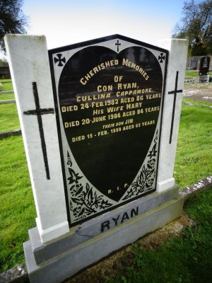 CHEERISHED MEMORIED OF CON RYAN CULLINA CAPPAMORE DIED 24TH FEB 1981 AGED 86 YRS HIS WIFE MARY DIED 20TH JUNE 1984 AGED 84 YRS THEIR SON JIM DIED 15TH FEB 1999 AGED 65 YRS
