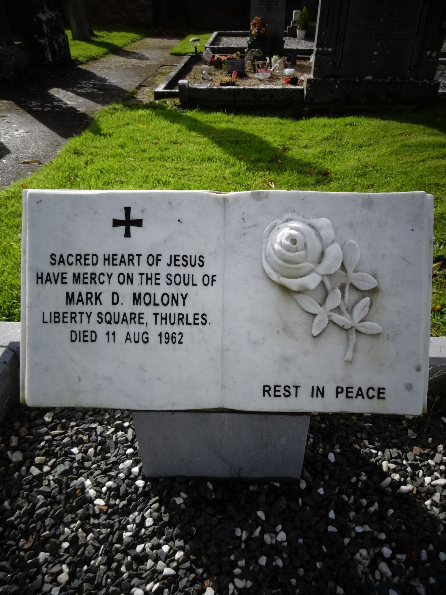 SACRED HEART OF JESUS HAVE MERCY ON THE SOUL OF MARK D MOLONY LIBERTY SQUARE THURLES WHO DIED 11TH AUG 1962 REST IN PEACE
