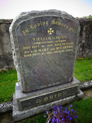 IN LOVING MEMORY OF WILLIAM O BRIEN DROMSALLY ROAD CAPPAMORE DIED SEPT 28TH 1999 AGED 88 YRS HIS WIFE MARY NEE MCCARTHY DIED SEPT 23RD 2001 AGED 86 YRS
