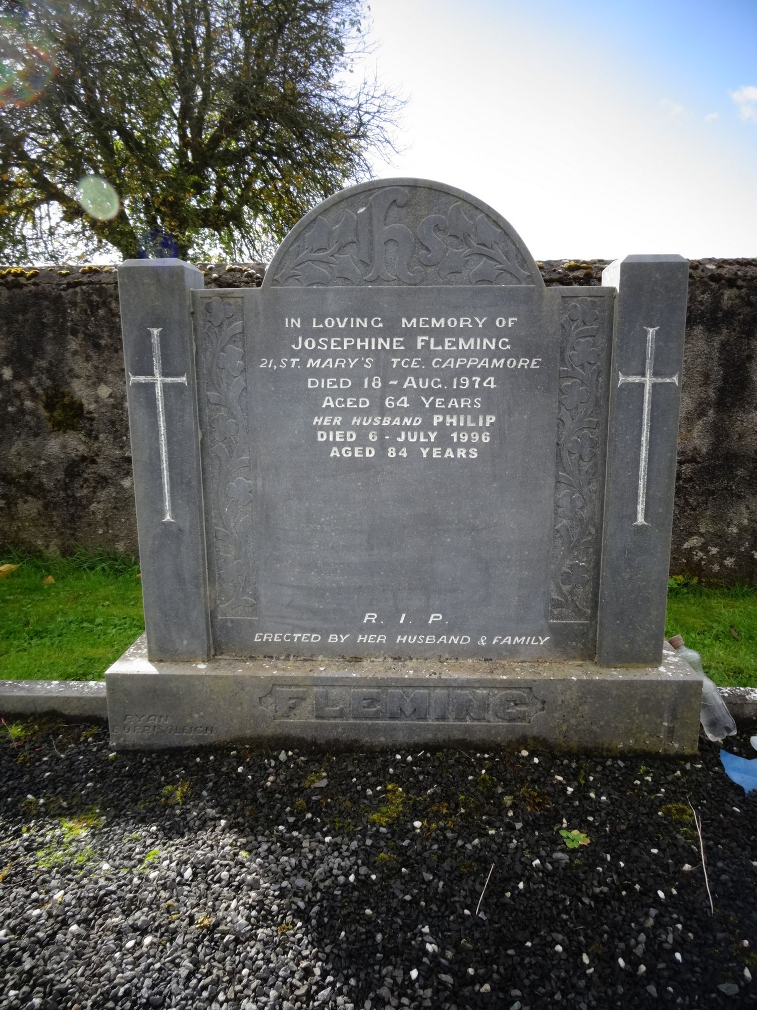 IN LOVING MEMORY OF JOSEPHINE FLEMING 21 ST MARY TCE CAPPAMORE DIED 18TH AUG 1974 AGED 64 YRS HER HUSBAND PHILIP DIED 6TH JULY 1996 AGED 84 YRS