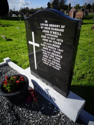 IN LOVING MEMORY OF MY DEAR HUSBAND JOHN O NEILL CAPPAMORE DIED 15TH OCT 1979 AGED 69 YRS HIOS WIFE ROSE DIED 3RD MARCH 1997 AGED 81 YRS THEIR SON SEAMUS DIED 3RD FEB 1998 AGED 49 YRS
