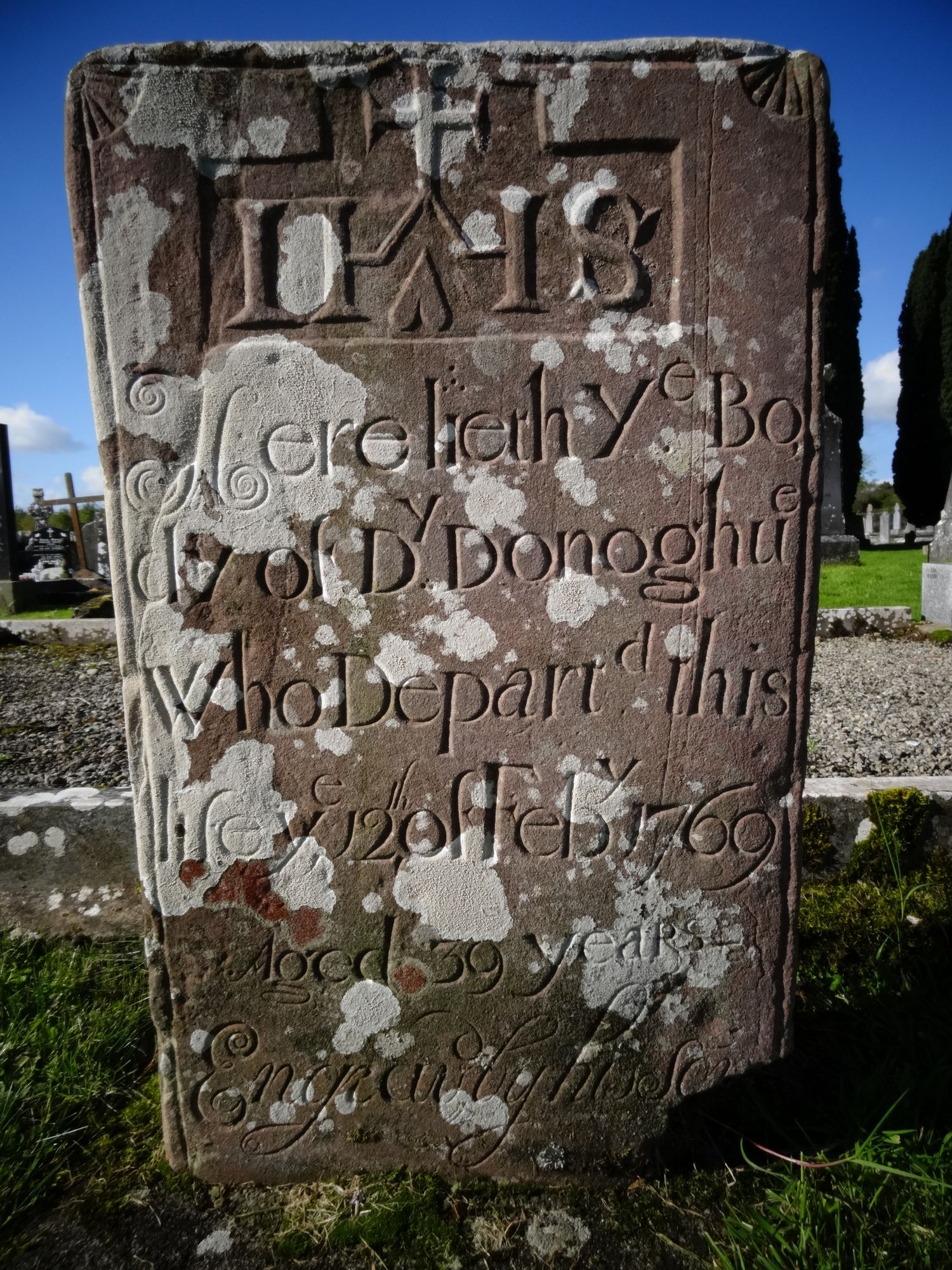 HERE LIETH Ye BO DY OF Dy DONOGHUE WHO DEPARTd THIS LIFE Ye 12th OF FEBy 1769 AGED 39 yr ENGRAVED BY HIS SON