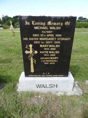 In Loving Memory OfMICHAEL WALSHKilfinnyDied 12TH April 1996His Sister MARGARET O'GRADYDied 1ST Sept. 1996MARY WALSH1910 - 2002KATIE WALSH1912 - 2005His Wife MARY( NEE MADIGAN )1922 - 2012