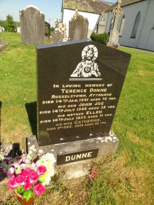 In loving memory of Terence Dunne, Russelstown, Attanagh, died 14th Jan. 1991 aged 72 years.His son John Joe died 14th July 1988 aged 32 years.His mother Ellen died 14th July 1953 aged 71 years.His wife Catherine died 2nd Dec. 2006 aged 89 years.