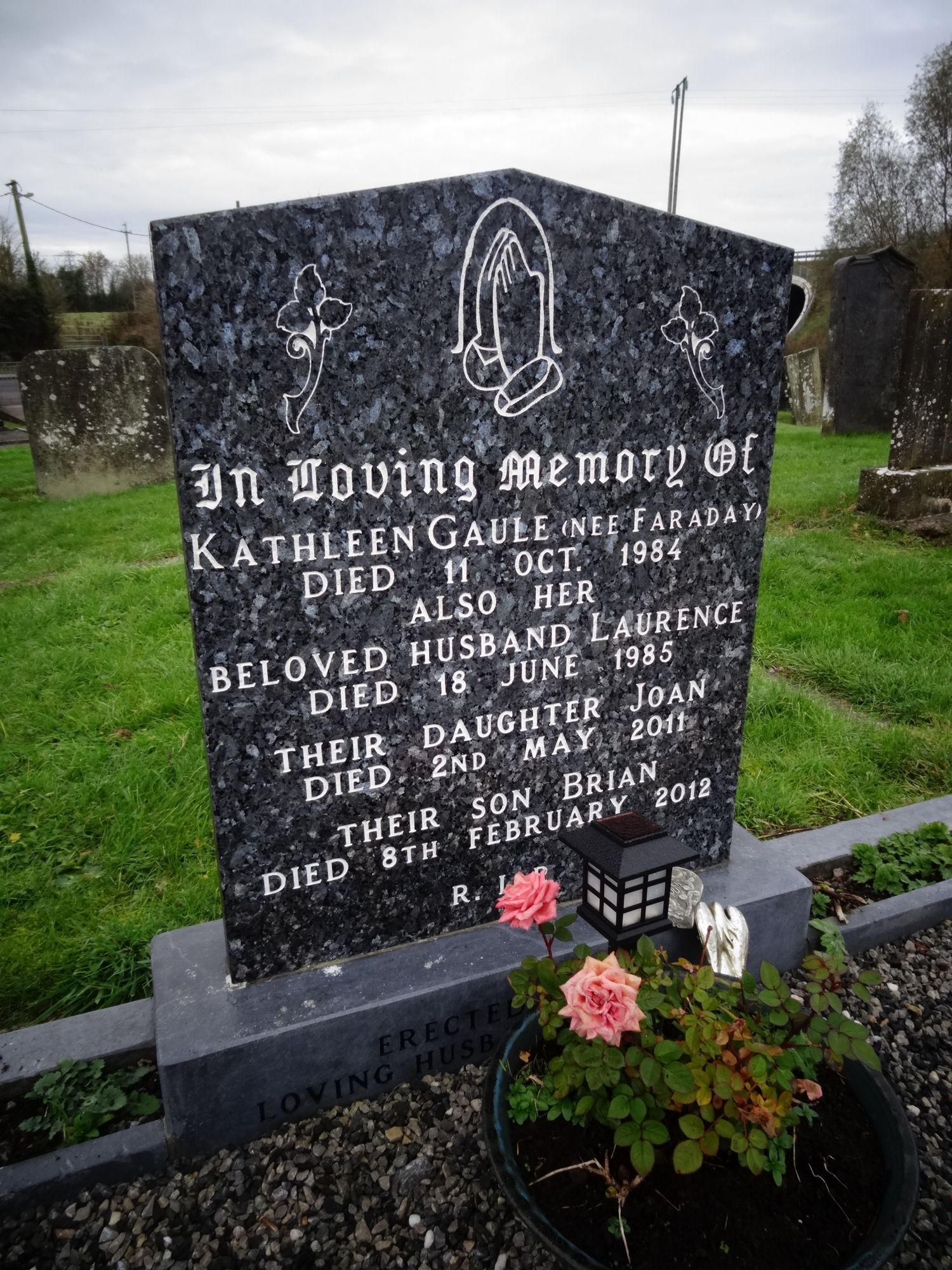 In loving memory of Kathleen Gaule (nee Faraday)Died 11 Oct 1984also her beloved husband LaurenceDied 18 June 1985their daughter Joan Died 2nd May 2011their son Brian Died 8th February 2012R.I.P.Erected by herloving husband and family