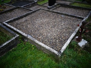 Kerbed grave plot with no memorial or headstone. Name only visible on side of kerbing