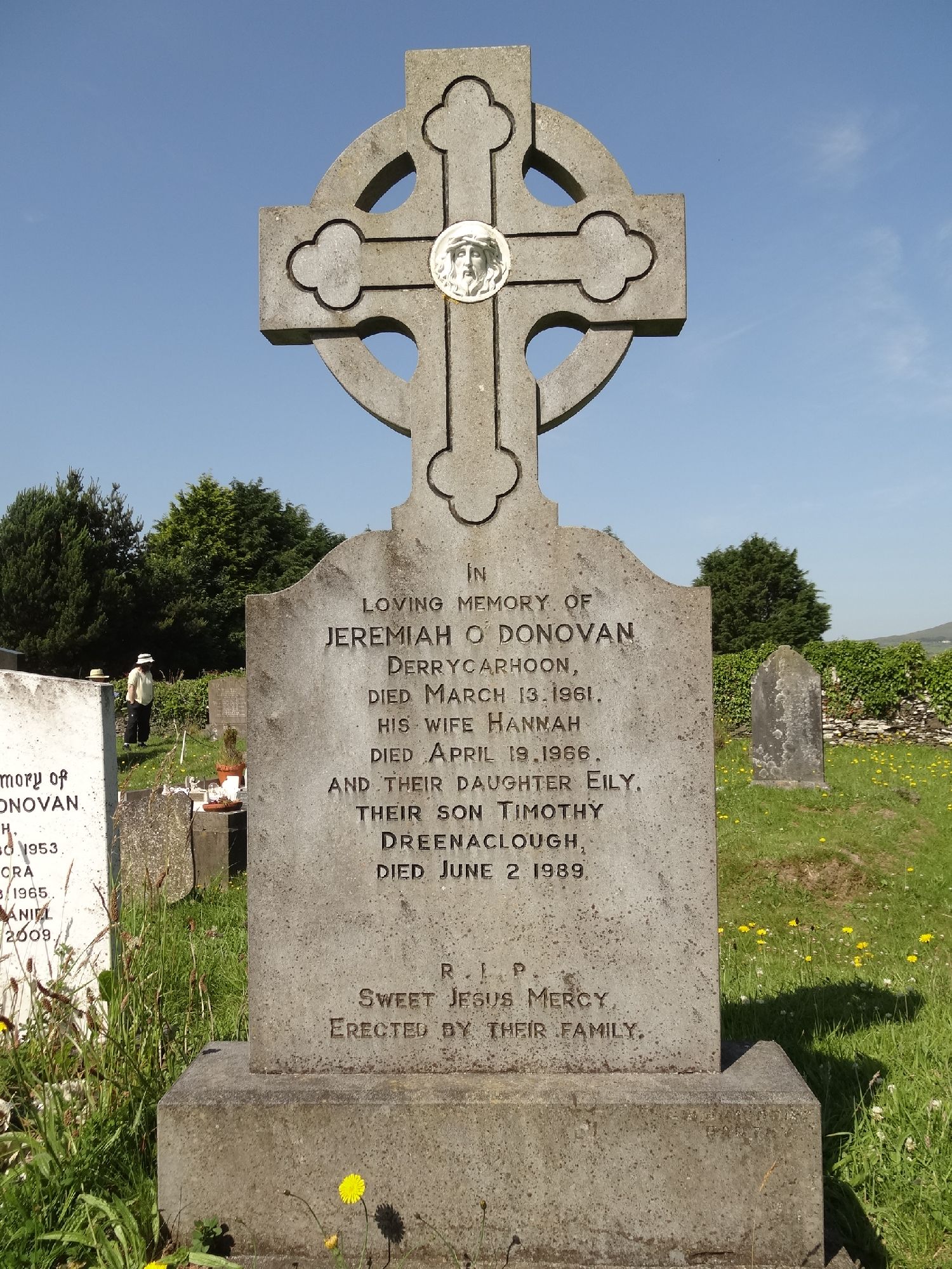 INLOVING MEMORY OFJEREMIAH O'DONOVANDERRYCARHOONDIED MARCH 13. 1961.HIS WIFE HANNAHDIED APRIL 19. 1966.AND THEIR DAUGHTER EILY.THEIR SON TIMOTHYDREENACLOUGH,DIED JUNE 2 1989