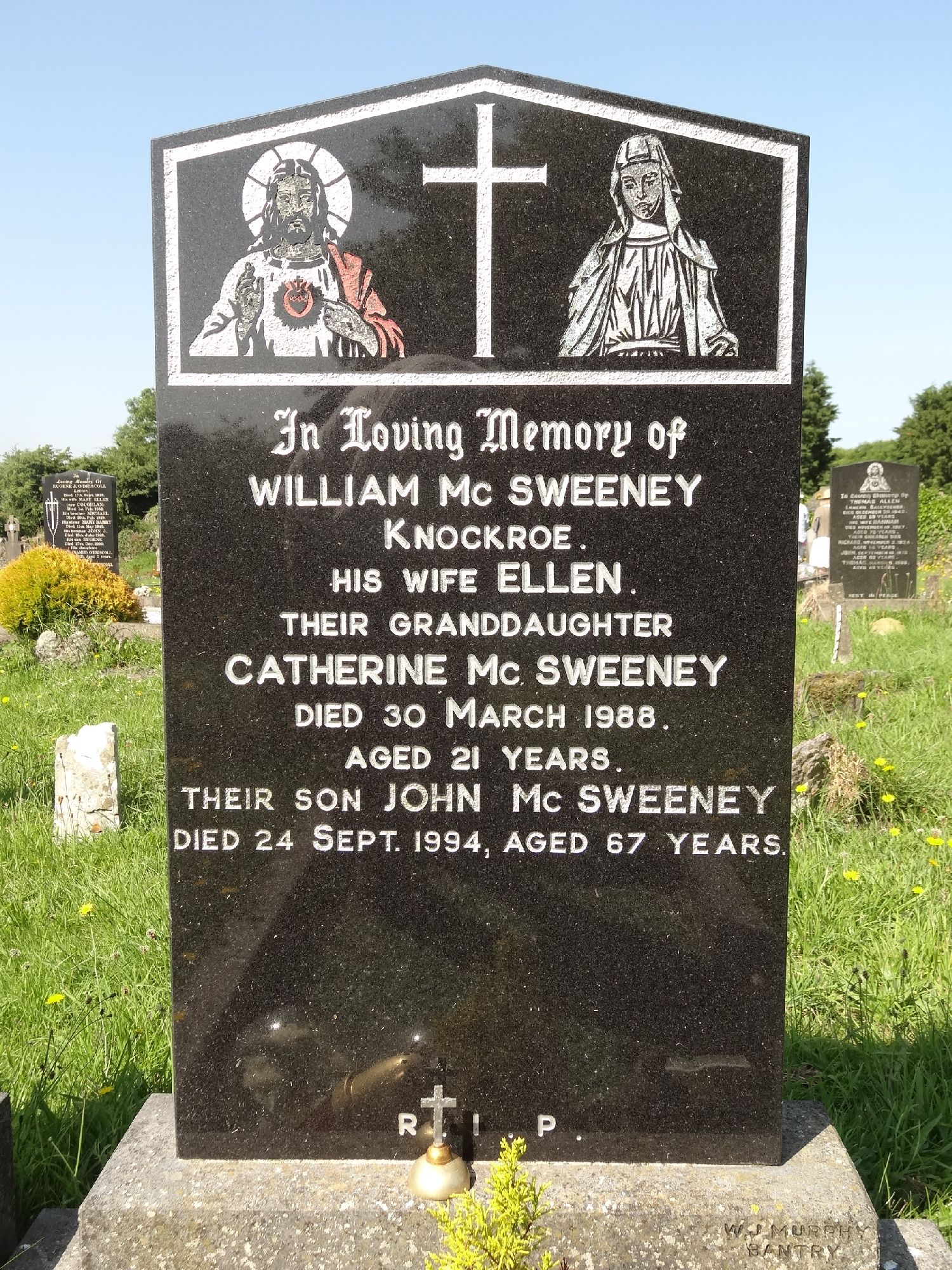 In Loving Memory OfWILLIAM McSWEENEYKNOCKROE.HIS WIFE ELLEN.THEIR GRANDDAUGHTERCATHERINE McSWEENEYDIED 30 MARCH 1988.AGED 21 YEARS.THEIR SON JOHN McSWEENEYDIED 24 SPET. 1994, AGED 67 YEARS.