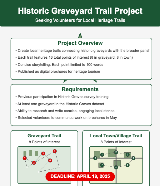 We are working on a new grassroots historic graveyard trail project and are seeking volunteers to get involved. If you have previously participated in Historic Graves survey training and would like to develop a local trail in your home parish please contact us at the next link (Google Form). Deadline for submissions is 18 April 2025 and applicants must have at least one graveyard in the Historic Graves dataset.