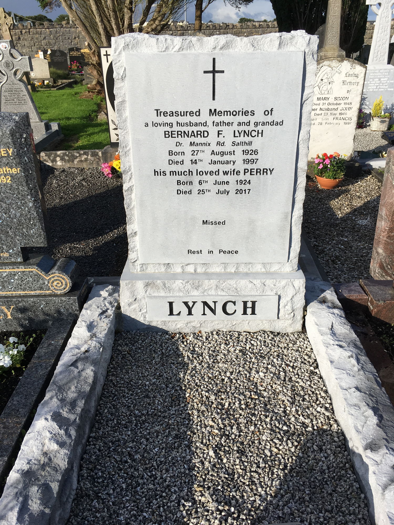 Treasured memories of a loving husband father and granddad, Bernard F Lynch, Dr Mannix Rd Salthill, born 27 Aug 1926, died 14 Jan 1997, his much loved wife Perry, born 6 June 1924, died 25 July 2017.