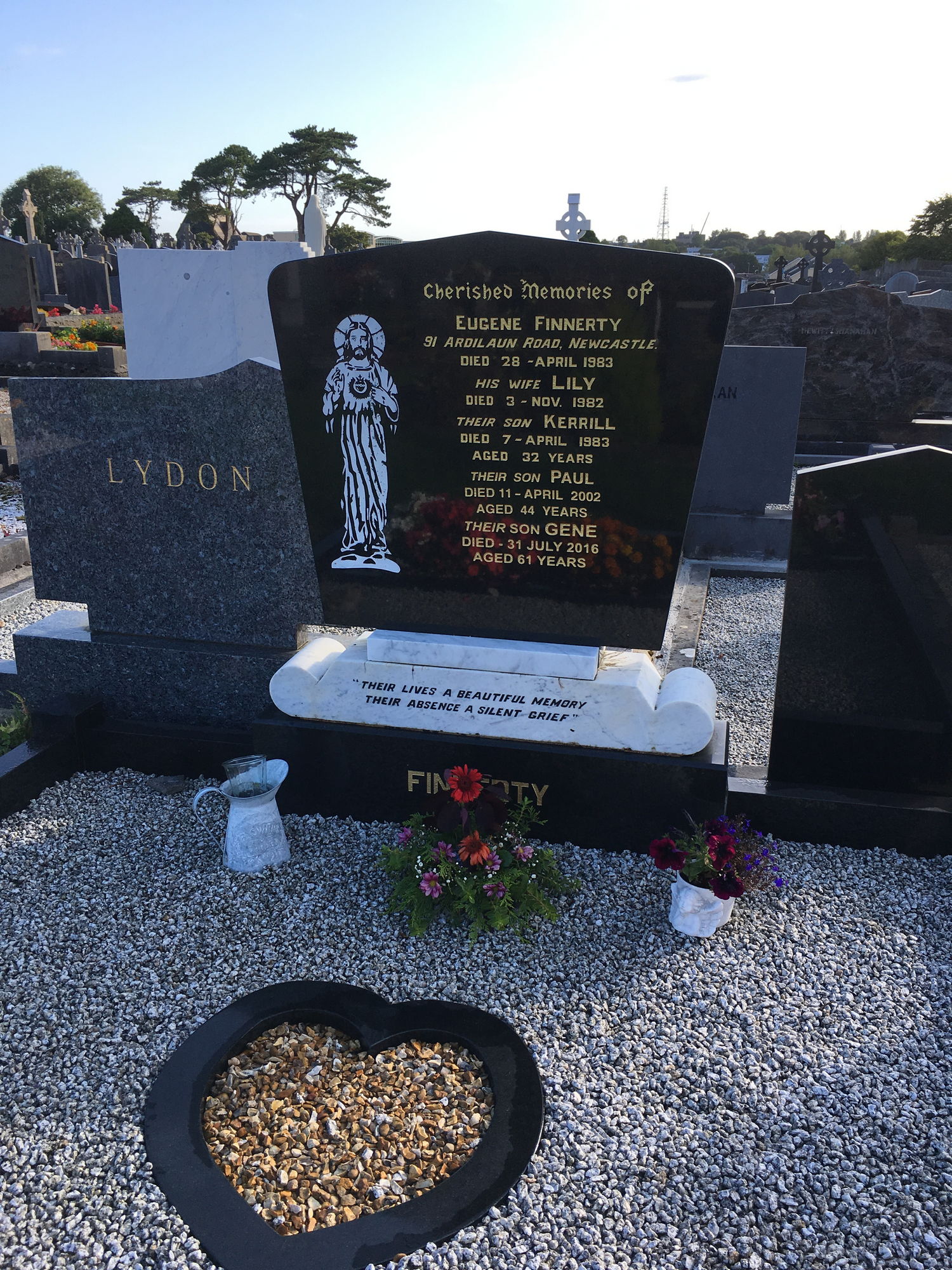 Treasured memories of, Eugene Finnerty, 91 Ardilaun Road Newcastle, died 28 April 1983, his wife Lily, died 3 Nov 1982, their son Kerrill, died 7 April 1983, aged 32 years, their son Paul, died 11 April 2002, aged 44 years, their son Gene, died 31 July 2016, aged 61 years.
