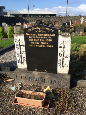 In loving memory of, Michael Cunningham, Upper Abbeygate St, died 25 Feb 1986, his wife Nora, died 27 April 1995.