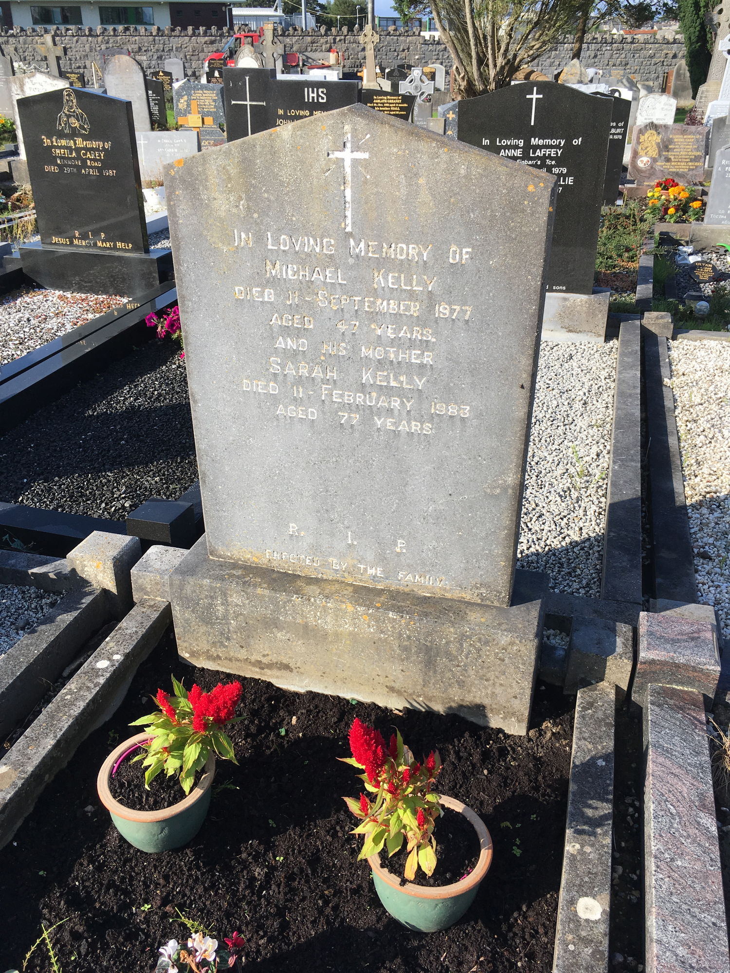 In loving memory of, Michael Kelly, died 11 Sept 1977, aged 47 years, and his mother, Sarah Kelly, died 11 Feb 1983, aged 77 years.