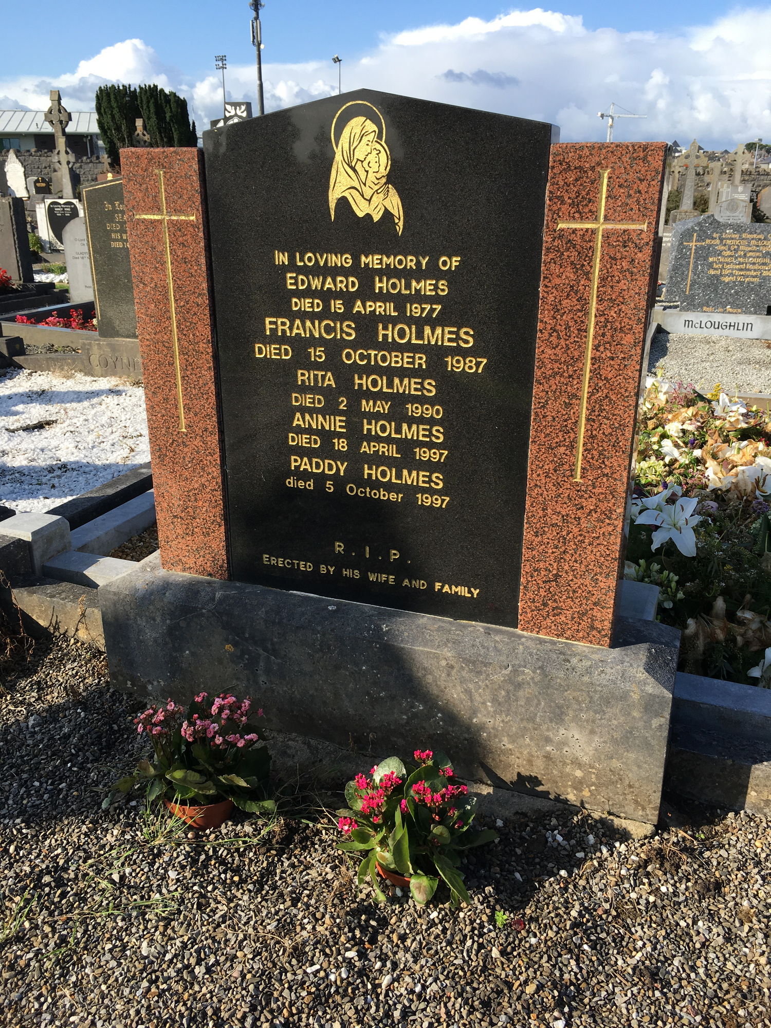 In loving memory of, Edward Holmes, died 15 April 1977, Francis Holmes, died 15 Oct 1987, Rita Holmes, died 2 May 1990, Annie Holmes, died 18 April 1997, Paddy Holmes, died 5 Oct 1997.