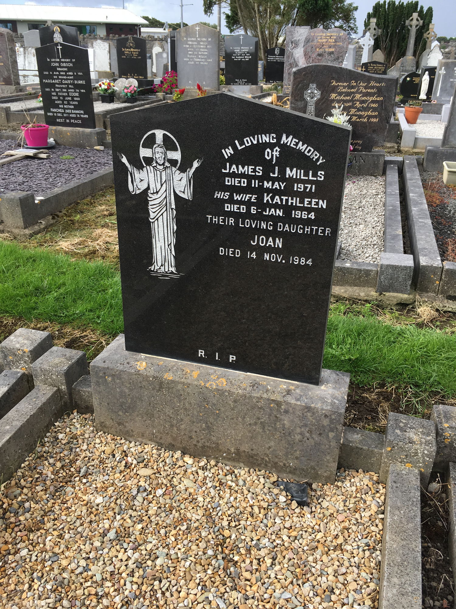 In loving memory of, James J Mills, died 11 May 1971, his wife Kathleen, died 6 Jan 1964, their loving daughter, Joan, died 14 Nov 1984.