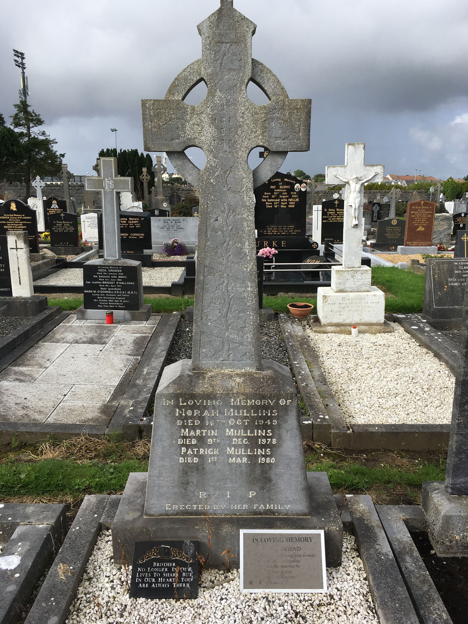 In loving memory of Norah Mullins, died 16 Oct 1949, Martin Mullins, died 9 Dec 1978, Patrick Mullins, died 1 March 1980.