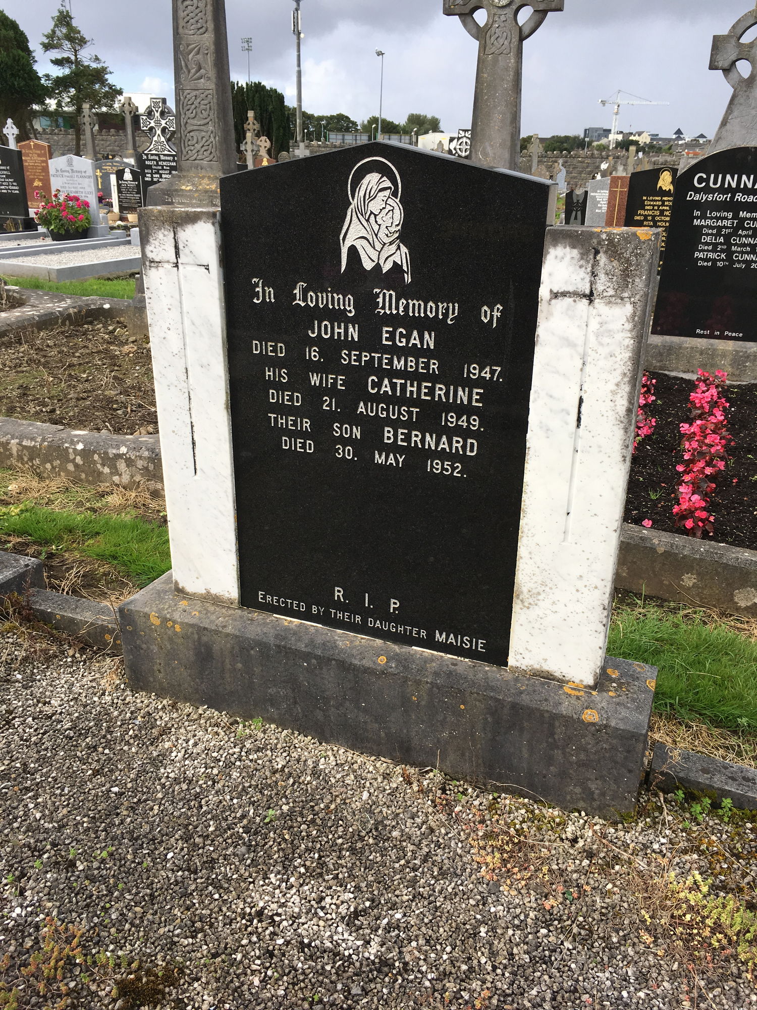 In loving memory of, John Egan, died 16 Sept 1947, his wife Catherine, died 21 Aug 1949, their son Bernard, died 30 May 1952.