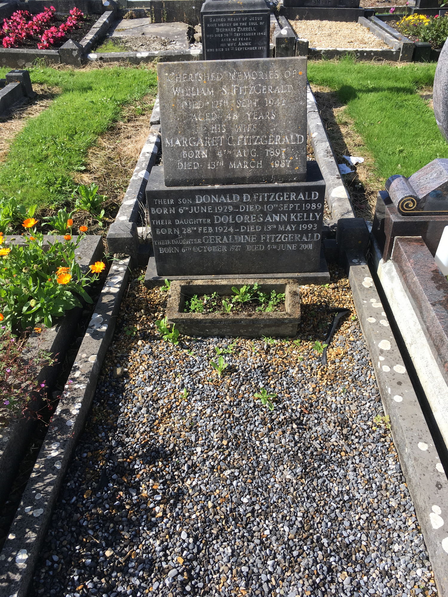 In loving memory of, William S Fitzgerald, died 12 Sept 1942, aged 48 years, his wife, Margaret C Fitzgerald, born 4 Aug 1897, died 13 March 1987. Their son Donald D Fitzgerald, born 6 June 1929 - died 10 Sept 1989, their daugher Doloros Ann Kelly, born 28 Feb 1924 - died 13 May 1993, their daugher Geraldine Fitzgerald, born 6 Oct 1927 - died 4 June 2001.