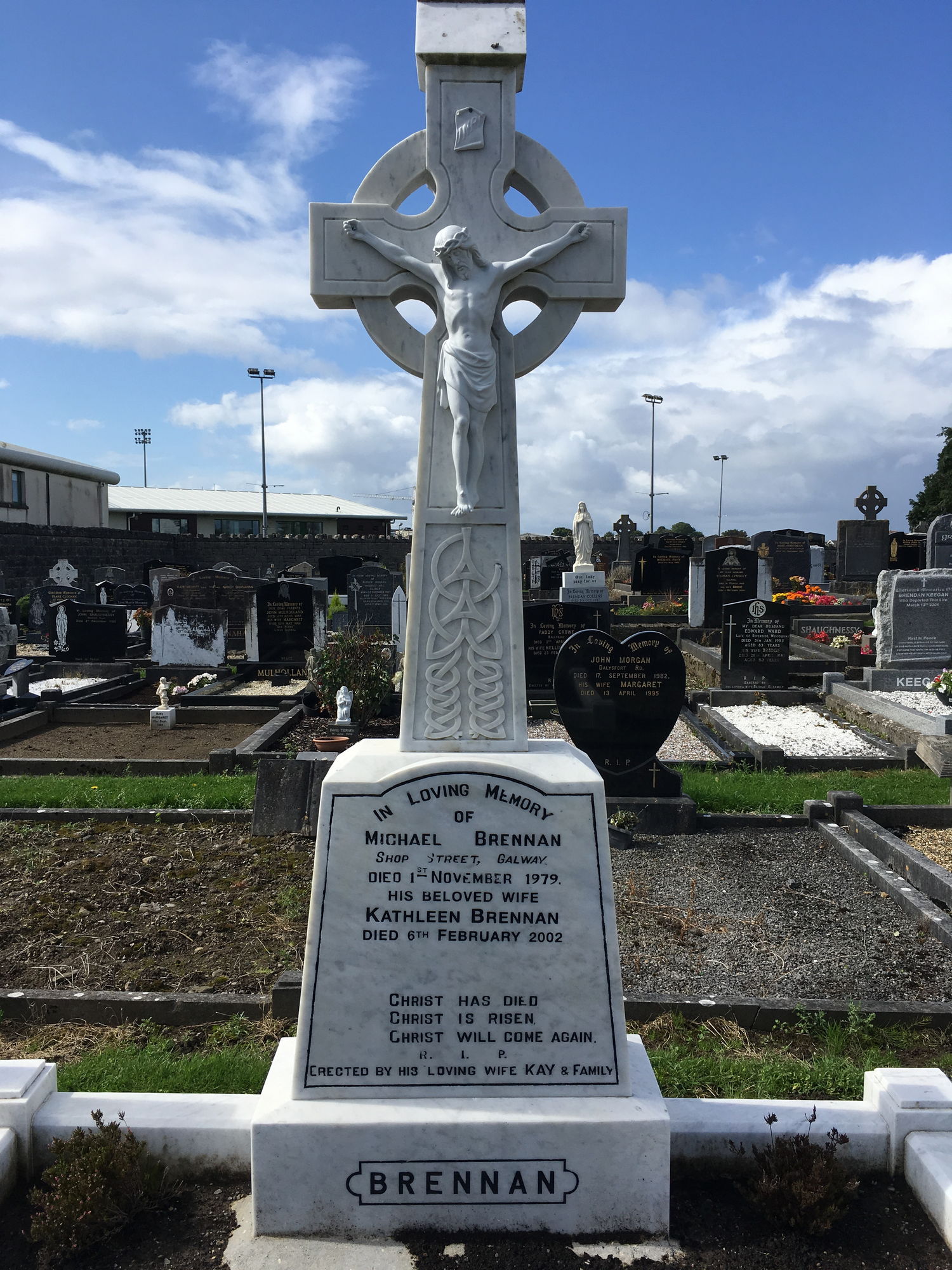 In loving memory of, Michael Brennan, Shop Street Galway, died 1 Nov 1979, his beloved wife, Kathleen Brennan, died 6 Feb 2002.