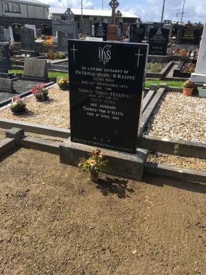 In loving memory of, Patricia (Paddy) O'Keeffe, Devon Park, died 12 Nov 1973, her son Thomas (Tommy) O'Keeffe, died 14 June 1980 aged 16 years, her husband Thomas (Tom) O'Keeffe, died 9 April 1995.