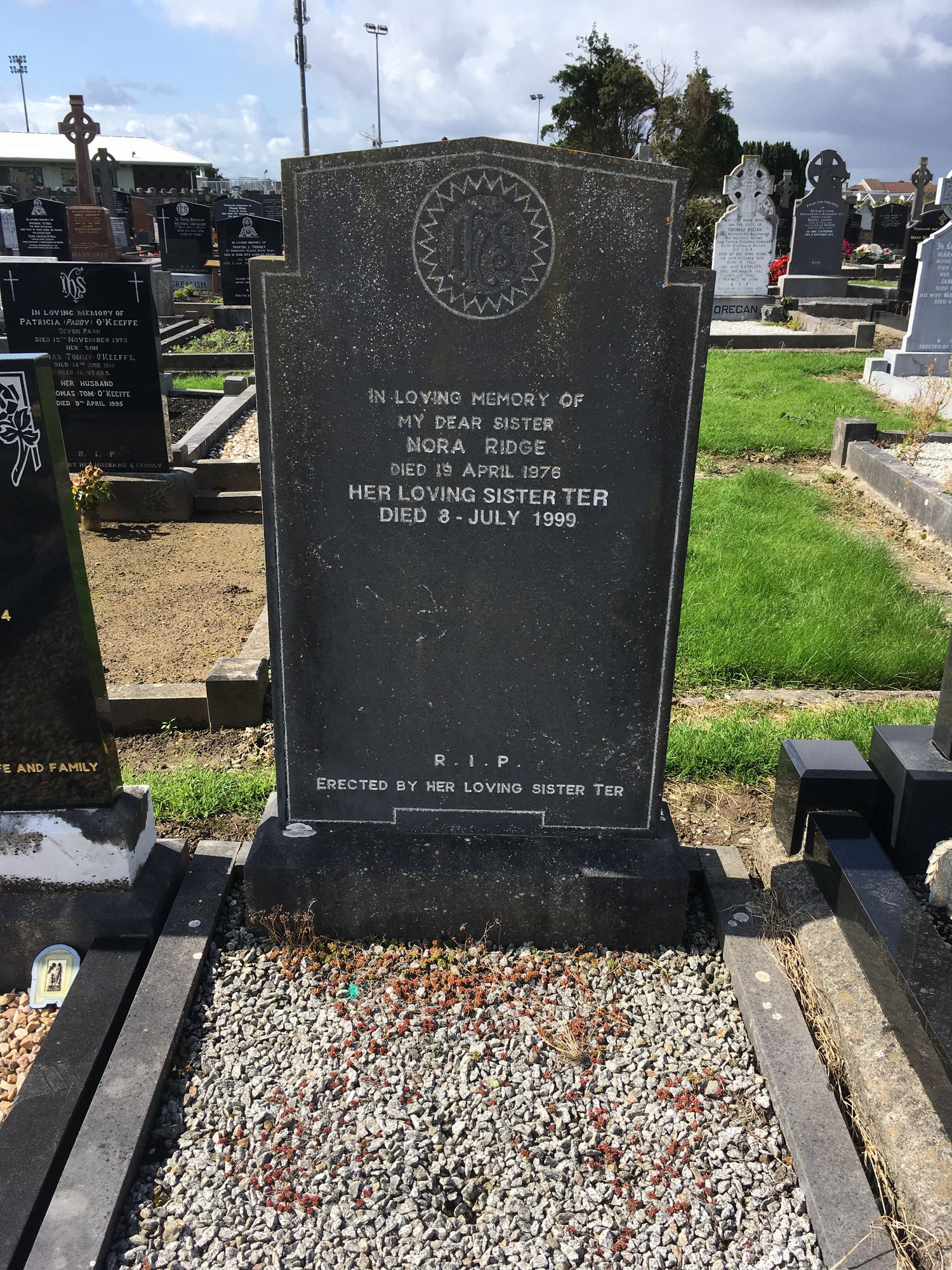 In loving memory of, my sister Nora Ridge, died 19 April 1976, her loving sister Ter, died 8 July 1999.